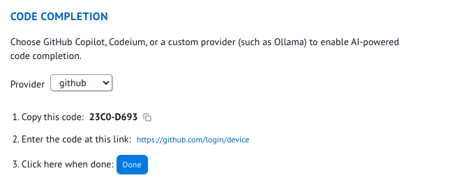 1. Ensure you have an LLM provider that offers API access for code completion (either external or running locally)