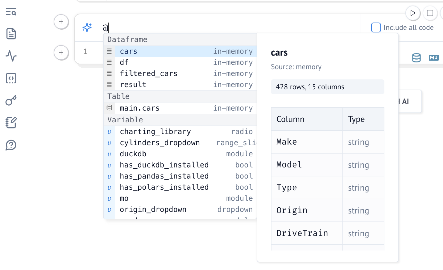 marimo's AI assistant has your notebook code as context. You can additionally pass variables and their values to the assistant by referencing them by name with @. For example, to include the columns of a dataframe df in your prompt, write @df.